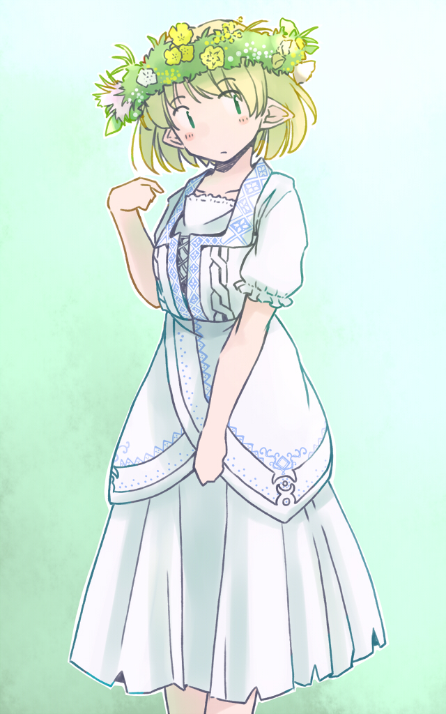 sorano eika, medicine melancholy, touhou, eyebrows, lowres, 1girl, black shirt, blonde hair, blue eyes, female focus, fog, hair ribbon, looking at viewer, puffy short sleeves, puffy sleeves, red ribbon, red skirt, ribbon, shirt, short sleeves, skirt, solo