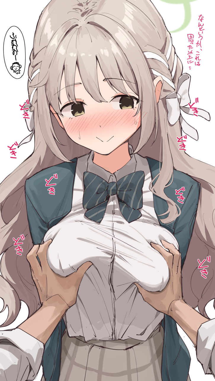 1boy1girlarousedaverting eyesblushbowbowtiebraidbreastsbrown hairc:closed mouthcollared shirtcowboy shotdiagonal-striped bowdiagonal-striped bowtiediagonal-striped clothesdress shirtembarrassedgrabbing another's breastgreen halogreen jacketgropinghair between eyeshair bowhair intakeshair ribbonhalojacketlarge breastslong hairlooking to the sidenose blushopen clothesopen jacketpovpov handsribbonribbon braidschool uniformshirtside braidssidelockssimple backgroundsmilesolo focussound effectsspeech bubblesplit mouthspoken characterstriped bowstriped bowtiestriped clothessweatdroptwin braidsvery long hairwavy hairwhite backgroundwhite bowwhite ribbonwhite shirtyellow eyes