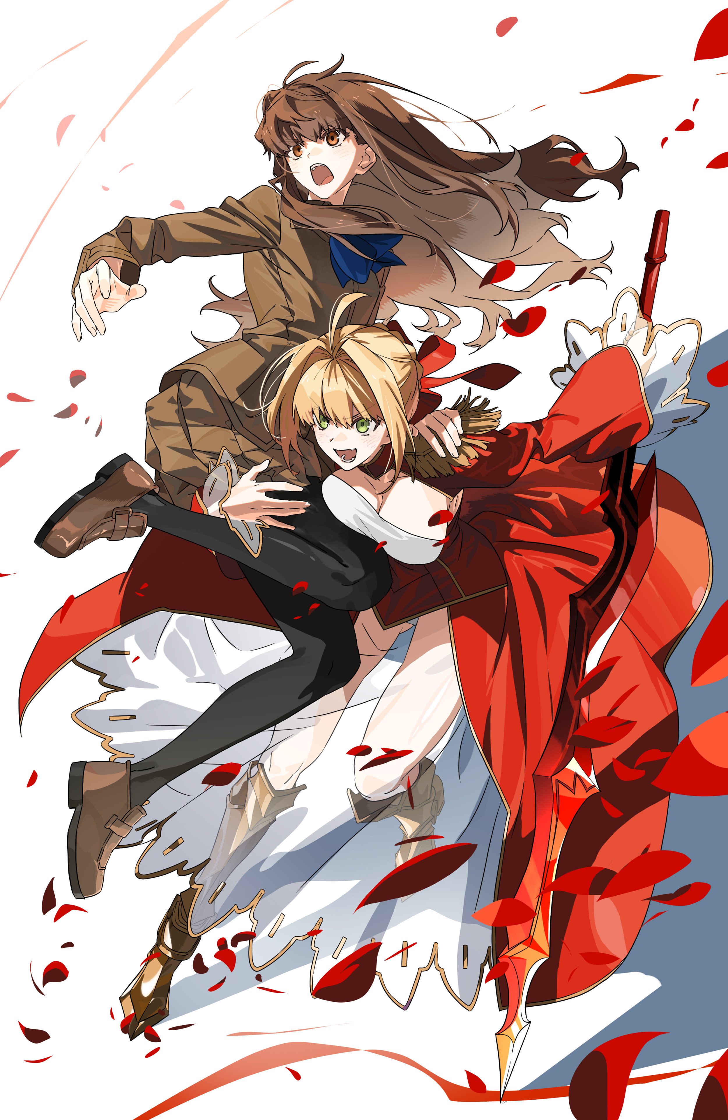 2girlsaestus estusahogearmored bootsblack pantyhoseblonde hairblue bowblue bowtiebootsbowbowtiebraidbreast pressbreastsbrown eyesbrown hairbrown jacketbrown shoesbrown skirtbun with braided baseepaulettesfalling petalsfull bodygreen eyeshair between eyeshair intakeshair ribbonhand on another's leghand on another's shoulderholdingholding swordholding weaponjacketleotardlifting personlight blushlong hairlong sleeveslooking aheadlower teeth onlymultiple girlsopen mouthoutstretched armpantyhosepetalspleated skirtqkqajrwkred ribbonred shrugred skirtribbonschool uniformsee-through clothessee-through skirtshoesshowgirl skirtshrug (clothing)simple backgroundskirtsmilestandingstanding on one legswordteethtsukumihara academy uniform (fate/extra)upper teeth onlyv-shaped eyebrowsweaponwhite backgroundwhite leotardwind