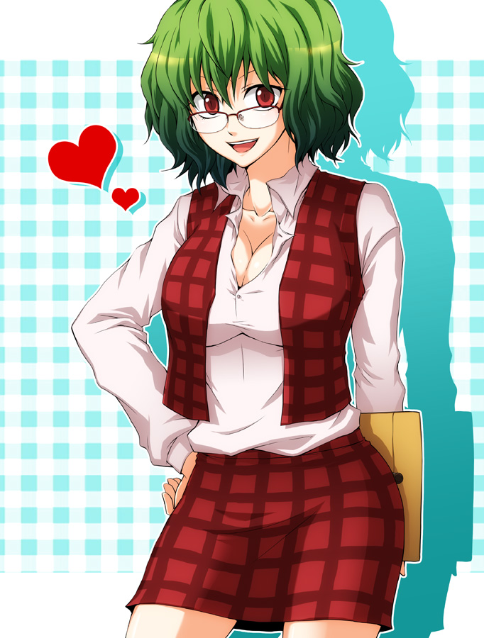 1girladapted costumebespectacledbreastscleavageenvelopefemale focusglassesgreen hairhand on own hiphearthip focuslarge breastsminiskirtopen mouthpencil skirtplaid backgroundplaid clothesplaid skirtplaid vestred eyesshort hairskirtskirt setsmilesolovest