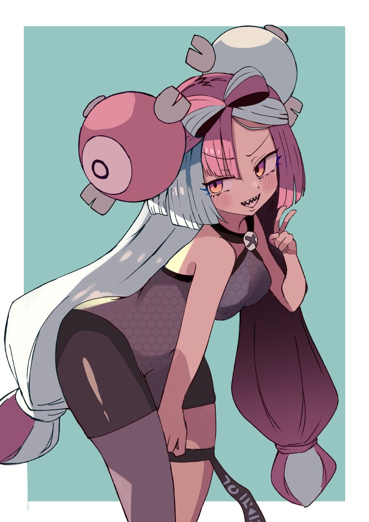 1girlbent overblue hairborderbow-shaped hairbreastscharacter hair ornamentgreen backgroundhair ornamenthand on own thighlong hairmedium breastsmulticolored hairno jacketopen mouthoutside borderpink eyespink hairscrewsharp teethsingle leg pantyhosesmilesoloteeththigh straptwo-tone hairvv-shaped eyebrowswhite border