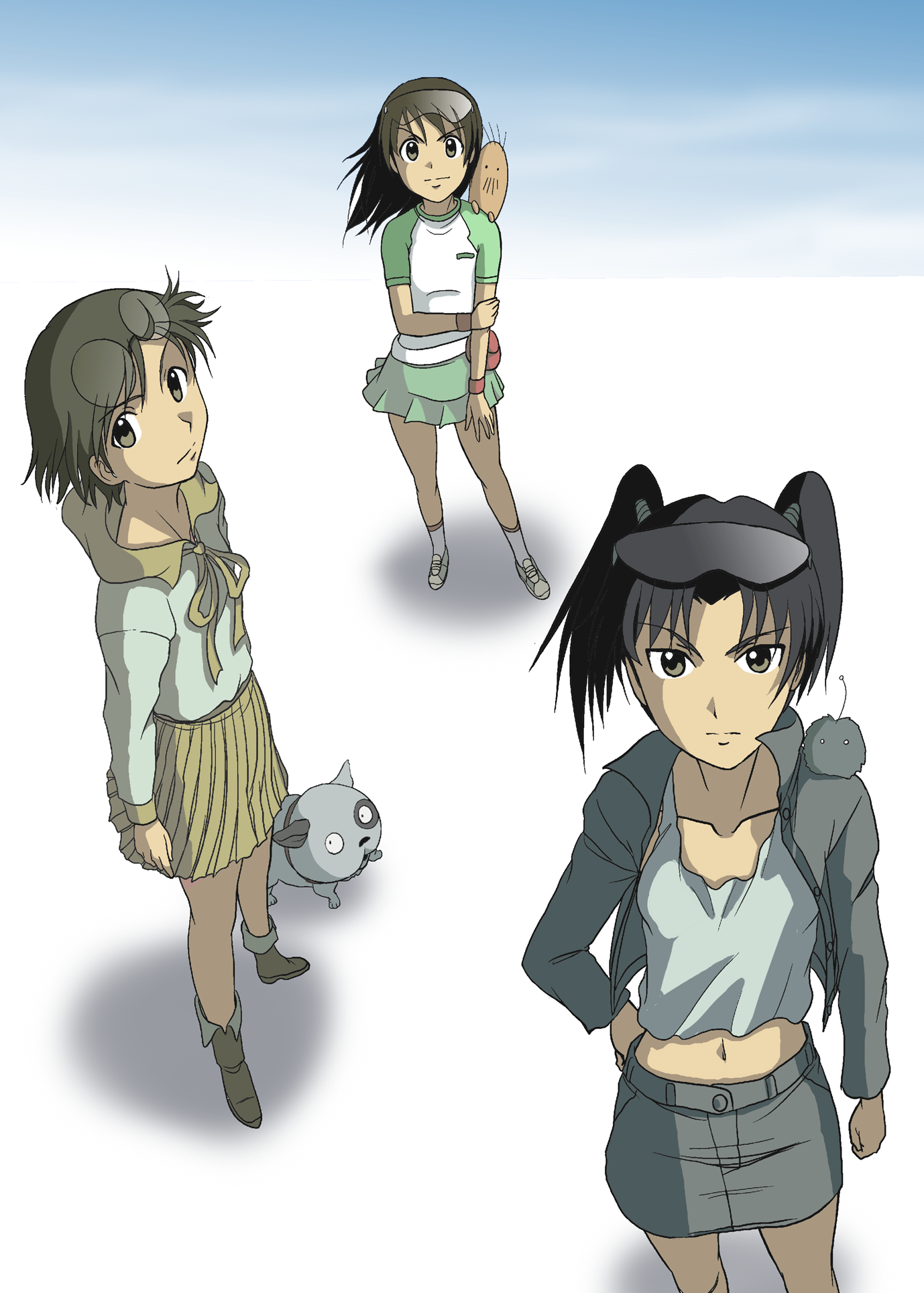 00s3girlsblack hairdogglassesjacketmidriffmultiple girlspencil skirtraglan sleevesshort hairskirttwintails