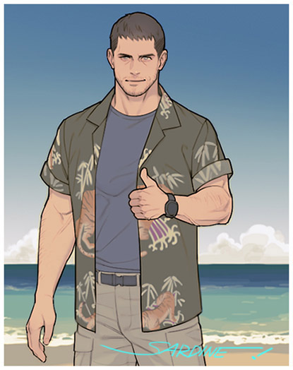 1boyartist namebeachbeard stubbleblack hairblack shirtblue skycloudfacial hairoceanpantsshirtsignatureskysmilestubblethumbs upwatchwristwatch