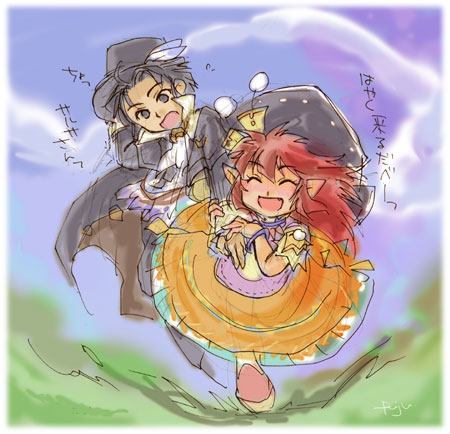 escaflowne, kanzaki hitomi, van fanel, tenkuu no escaflowne, official art, 1990s (style), 1boy, 1girl, bow, copyright name, dragon, pink bow, pleated skirt, retro artstyle, school uniform, serafuku, skirt, sword, topless male, weapon, wings
