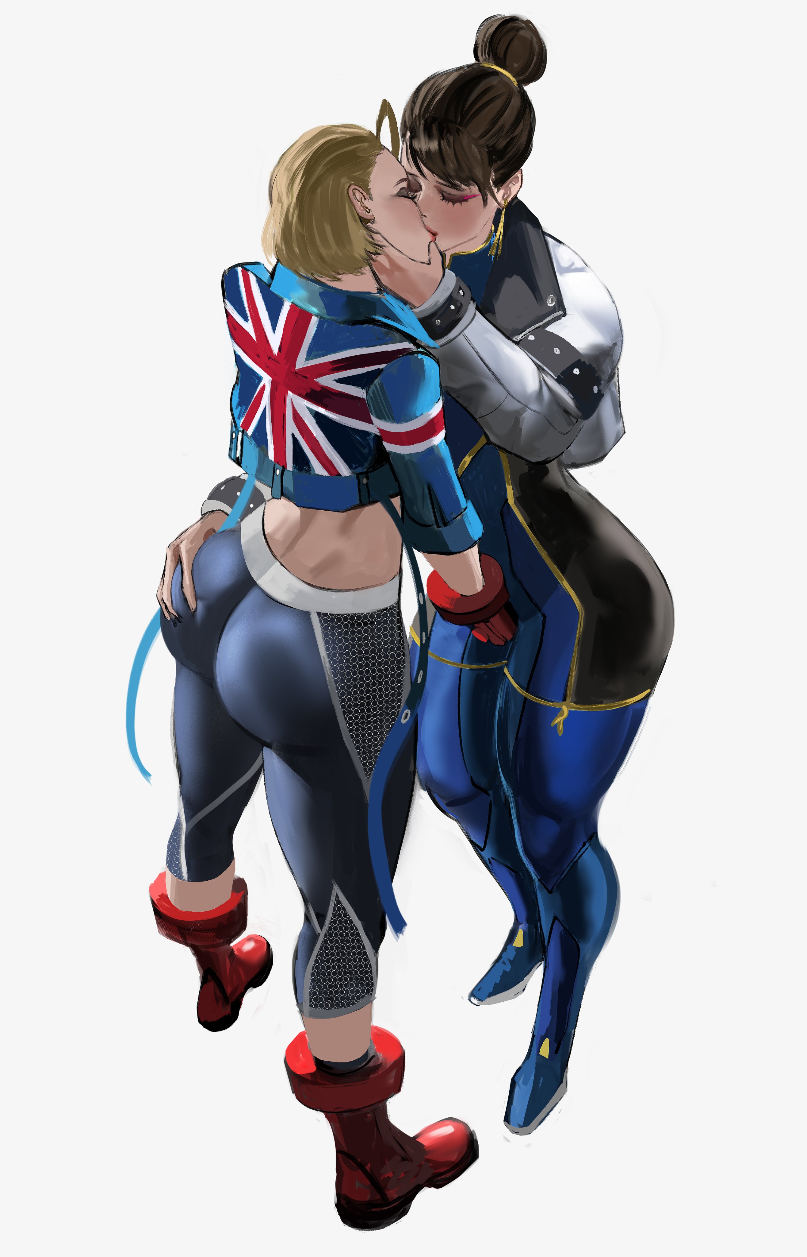 2girlsassblonde hairblushbraceletbrown hairclosed eyesearringsgloveshair bunhand on another's asshand on another's cheekhand on another's crotchhand on another's facehuge assjacketjewelrykissmultiple girlsnavelshort hairsimple backgroundspiked braceletspikesthick thighsthighstight clothesunion jackwhite jacketyuri