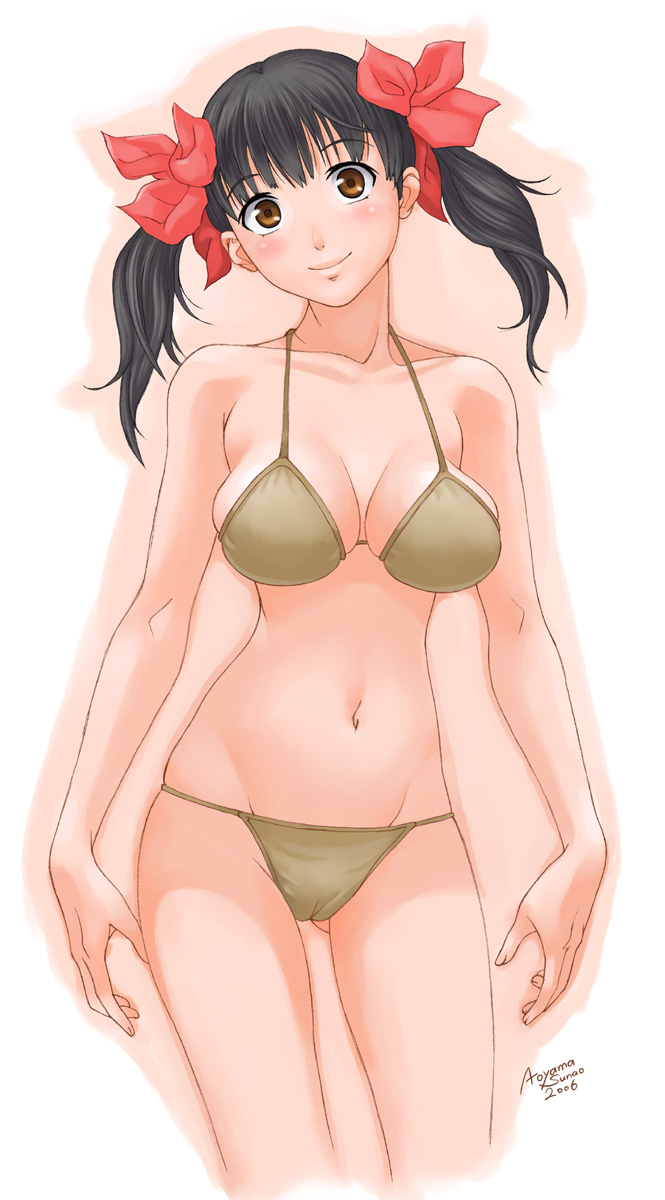 1girlbikiniblack hairblushbreastsbrown eyescleavagefemale focuslong hairnavelsmilesolostring bikiniswimsuittwintails