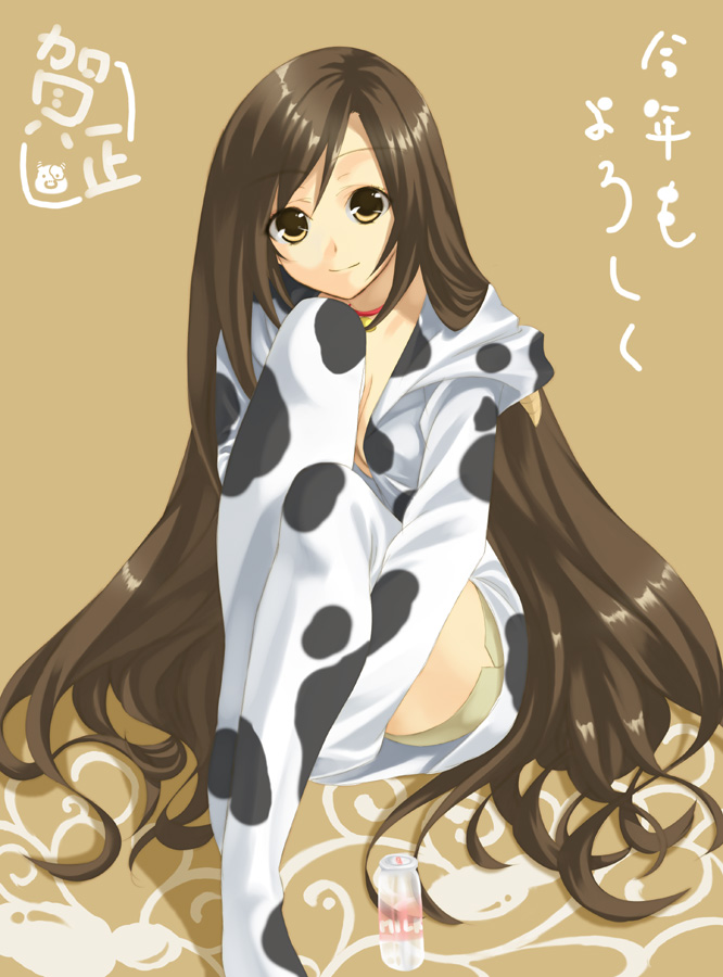 1girlanimal printbottlebreastsbrown haircleavagecow printfemale focuskotoyorolong hairmedium breastsmilk bottlenew yearshortssmilesolovery long hairyellow eyes