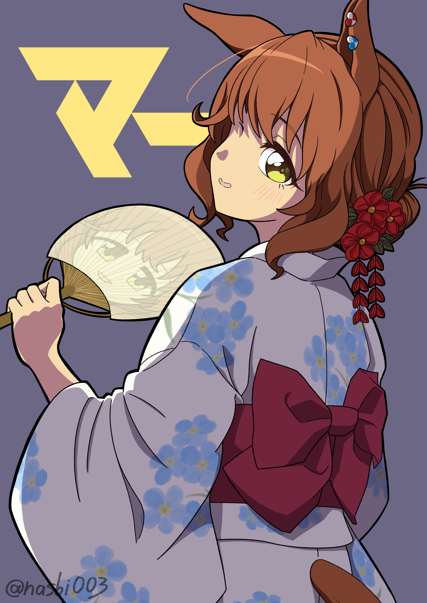 1girlalternate costumeanimal earsarmorblushbowbrown hairear ornamentfloral printfloral print kimonoflowergreen eyeshair between eyeshair bunhair flowerhair ornamenthand fanholdingholding fanhorse earshorse girlhorse tailjapanese armorjapanese clotheskimonolooking at viewerlooking backmedium hairobiopen mouthpaper fanprint kimonored bowsashsmilesolotailuchiwawhite kimonoyukata