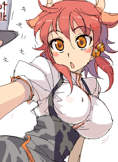 1girlanimal earsanimal printbellbreastscow earscow girlcow printfemale focushornshuge breastsmilkred hairsolowaitressyellow eyes
