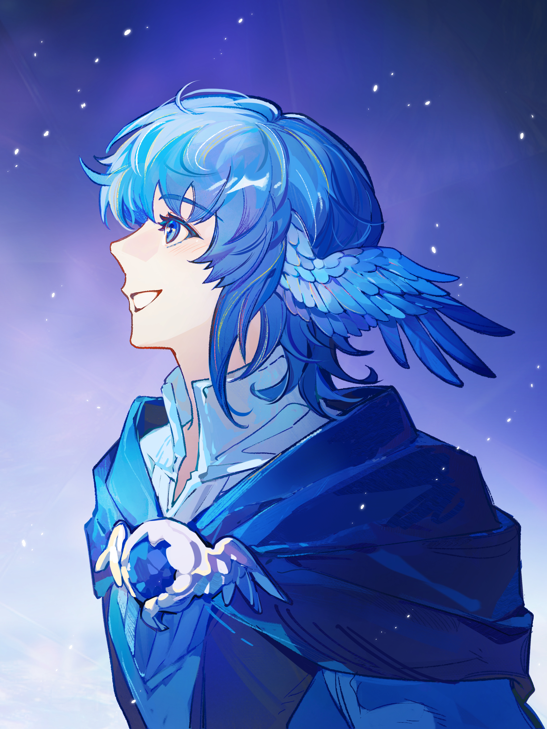 1girlbird wingsblue capeletblue eyesblue hairbroochcapeletfeathered wingsfrom sidehead wingsjewelryprofileshort hairskysmilesolostar (sky)starry skyupper bodywings