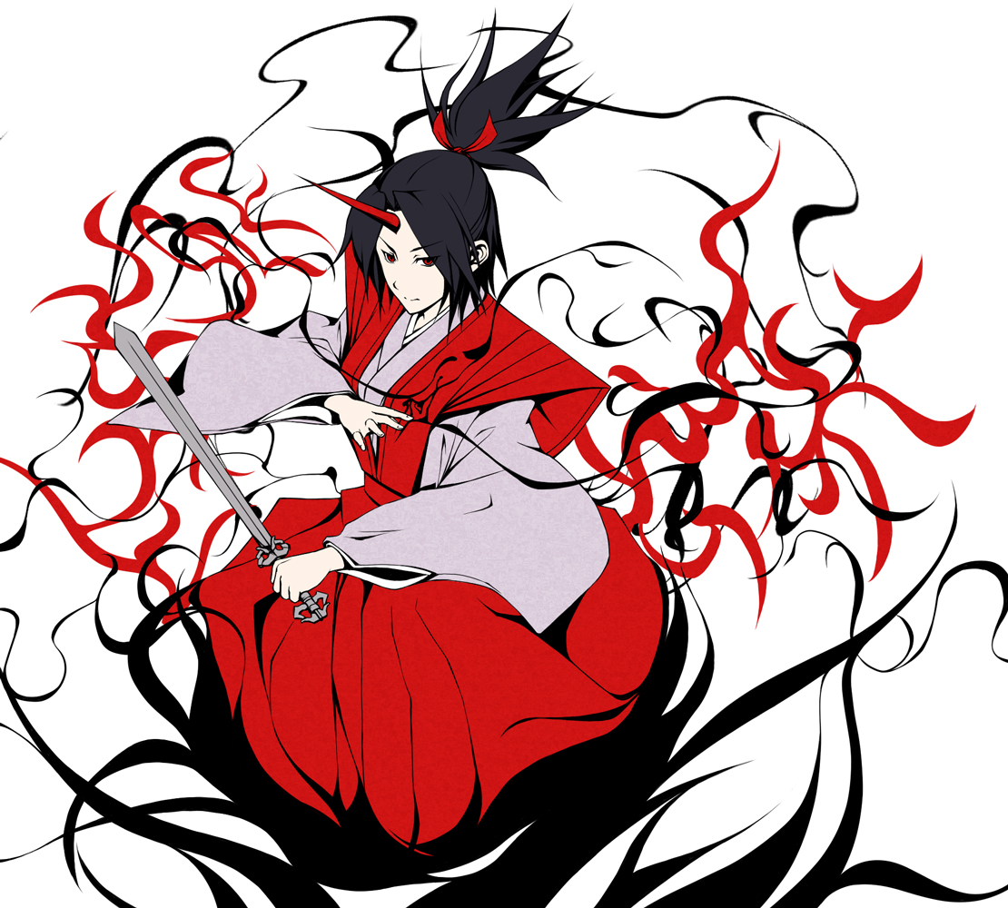 1girlfemale focushakamahakama skirthornsjapanese clotheskimonoleft-handedlong hairponytailred eyesred hakamasingle hornskirtsoloswordweapon