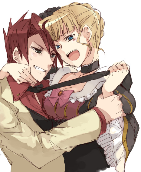 00s1boy1girlblonde hairblue eyesblushbowbreastschokercleavageclothes grabnecktienecktie grabneckwear grabopen mouthpink bowsmile