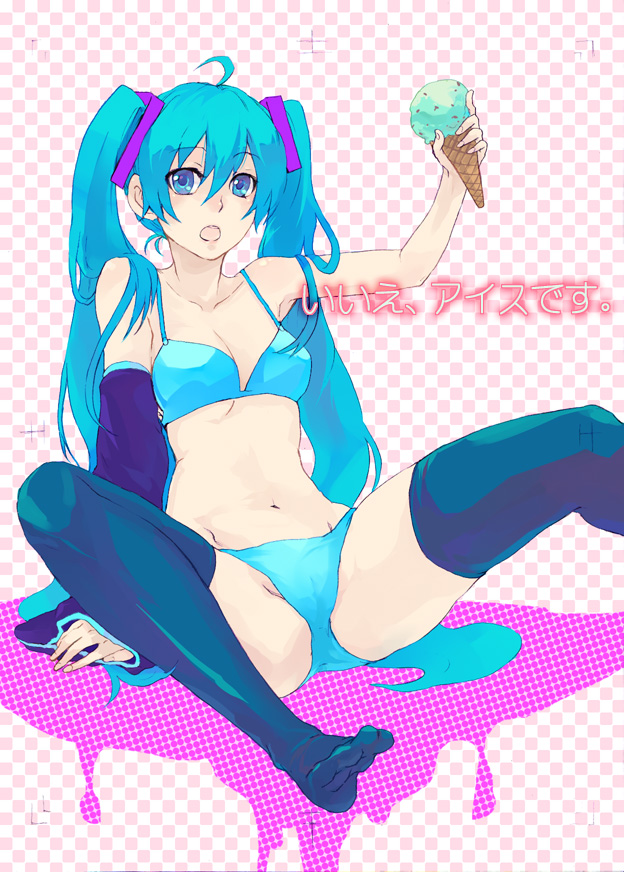 1girlahogeaqua eyesaqua hairbikiniblue eyesblue hairbrabreastsdetached sleevesfeetfemale focusfoodice creamlingerielong hairmatching hair/eyesopen mouthpantiessittingsoloswimsuitthighhighstwintailsunderwearvery long hair