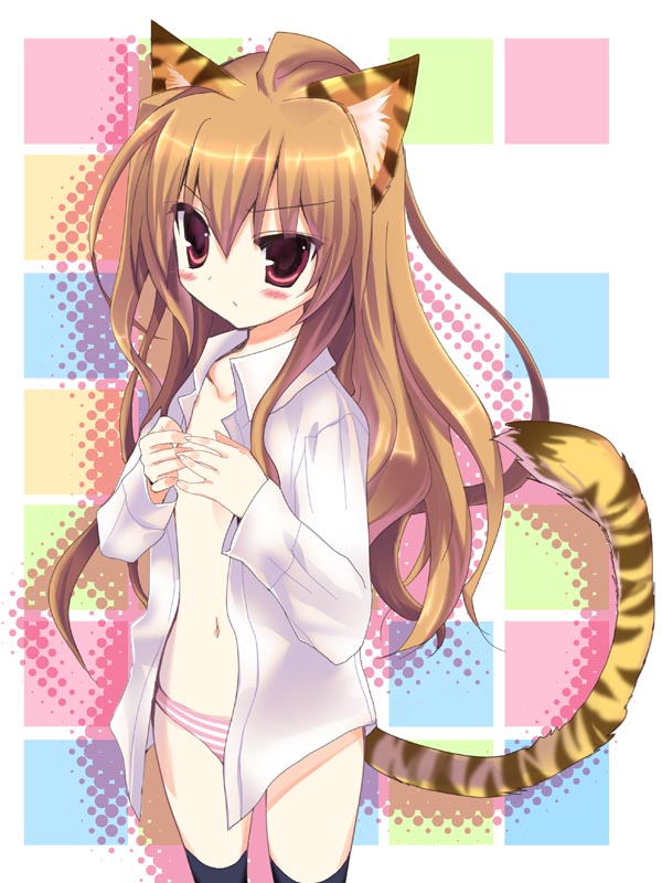 00sanimal earsblushflat chestlong hairopen clothesopen shirtpantiesshirtsolostriped clothesstriped pantiestailthighhighstiger earstiger tailunderwear