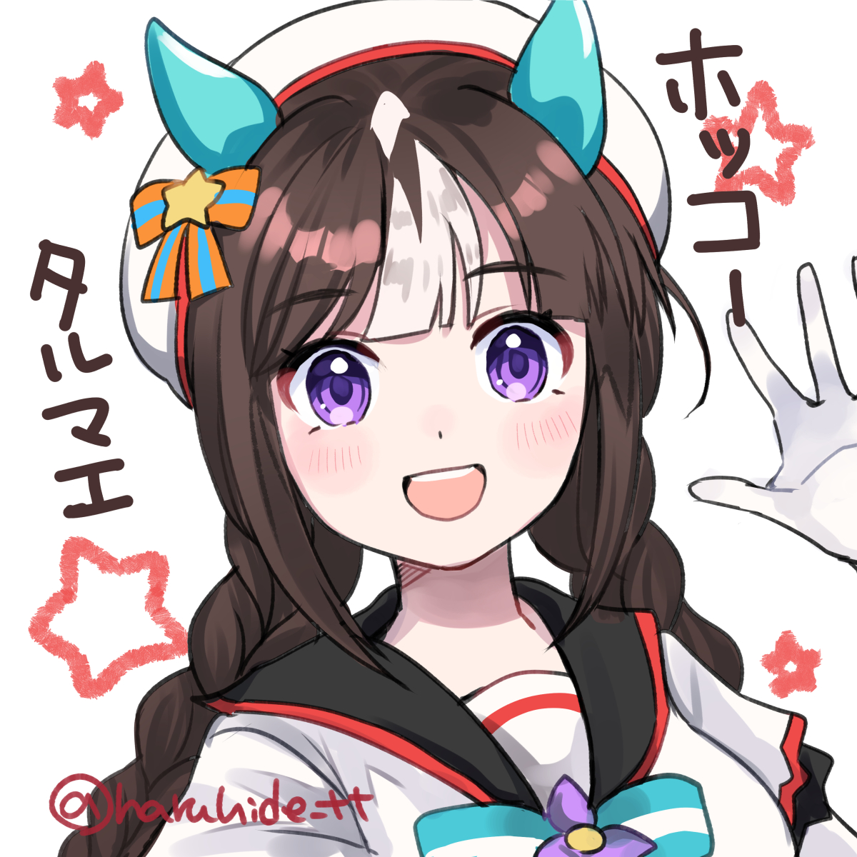 1girlanimal earsberetblack sailor collarblushbowbraidbreastsbrown hairear coversgloveshathorse earshorse girllong braidlong hairlooking at viewermulticolored hairopen mouthpurple eyessailor collarshirtsmilesolostar (symbol)striped bowstriped hairteethtwin braidsupper bodyupper teeth onlywhite gloveswhite hairwhite hatwhite shirt