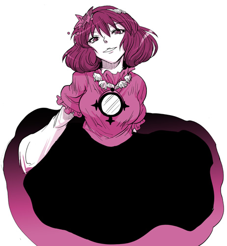 ebora, typhon ephemeros (fate), fate/grand order, fate (series), absurdres, bad link, highres, 1girl, bag, beret, black flower, black hat, black rose, black skirt, black vest, breasts, collared shirt, flower, flower over eye, grin, hair between eyes, hat, long hair, long hair between eyes, looking at viewer, pantyhose, red hair, rose, school bag, school uniform, shirt, simple background, skirt, small breasts, smile, solo, thighs, very long hair, vest, white pantyhose, white shirt, yellow eyes