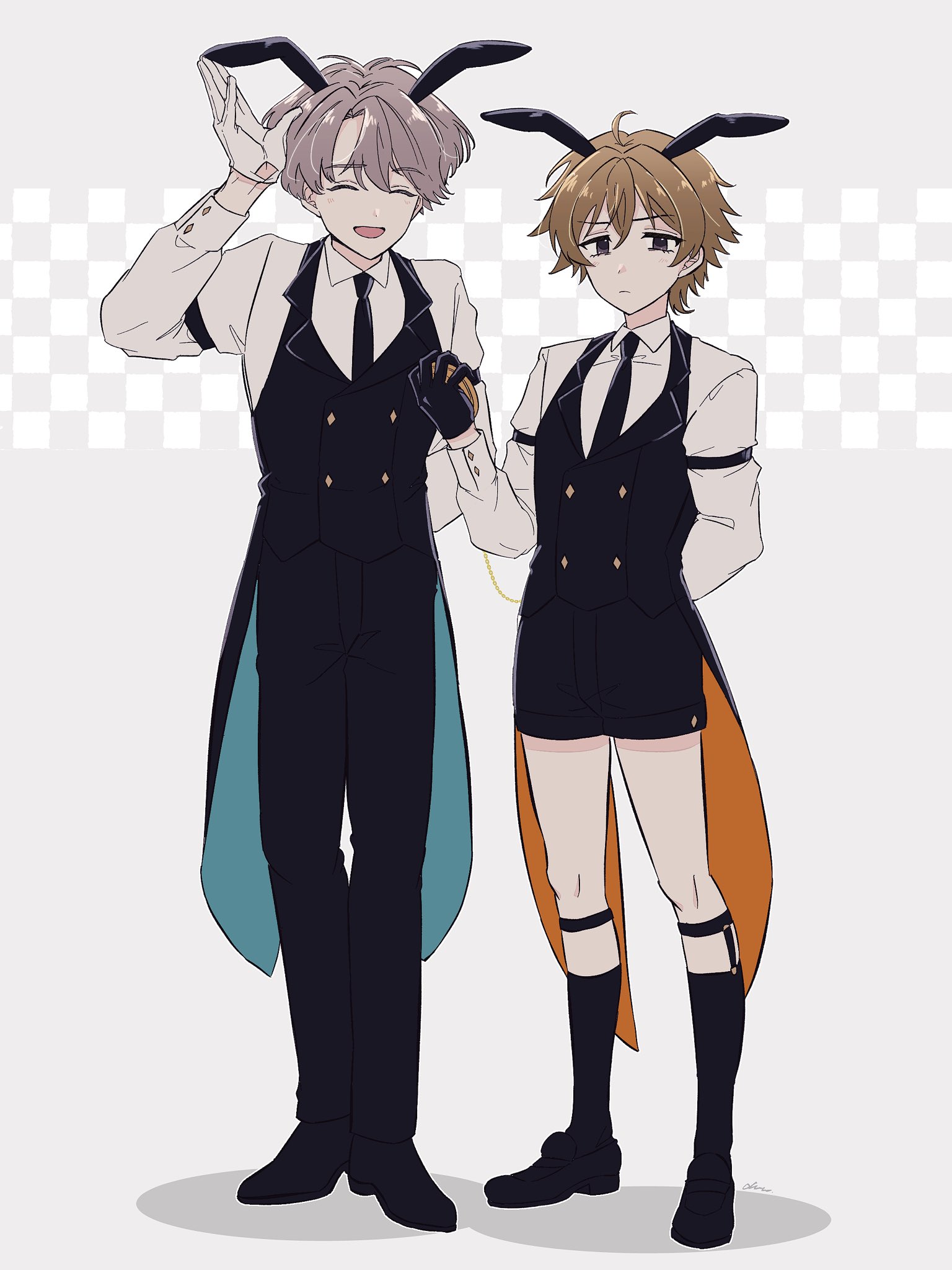 kasasagi (hinagi), squalo, tiziano, jojo no kimyou na bouken, vento aureo, highres, 2boys, :d, black gloves, black headband, blonde hair, blue eyes, blue headband, chibi, chibi only, dark-skinned male, dark skin, gloves, headband, long hair, looking at another, male focus, multiple boys, multiple views, open mouth, orange hair, outline, short hair, smile, striped clothes, vertical-striped clothes, white outline, yellow eyes