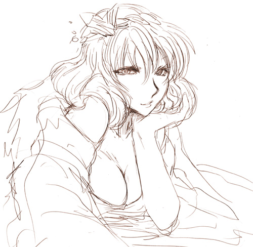 1girlbreastscleavagefemale focuslarge breastslooking at viewermonochromeshort hairsketchsoloupper bodywhite background