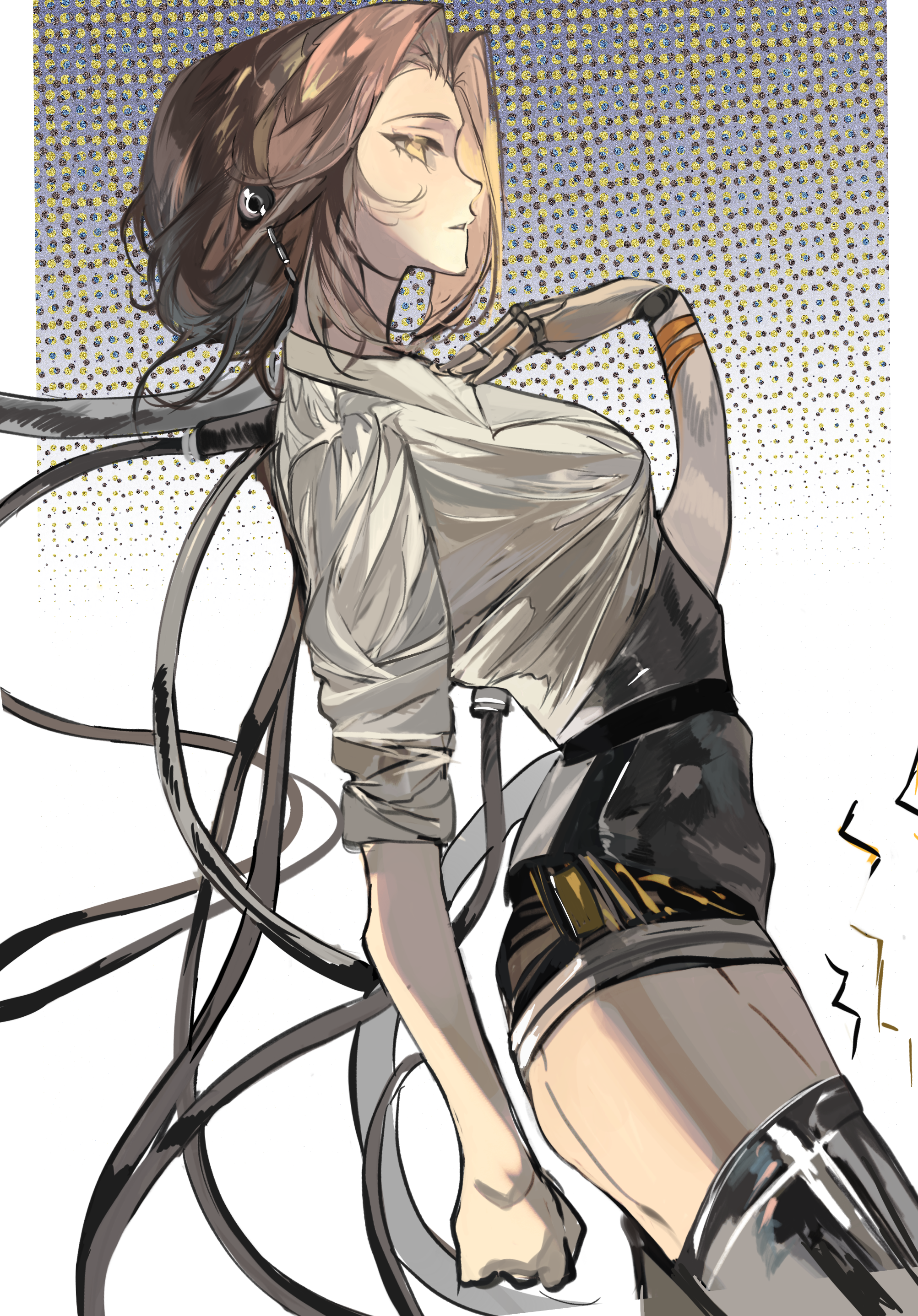 1girlandroidbrown haircablecowboy shotfrom sidegradient backgroundgrey backgroundhalftonehalftone backgroundhand on own chesthand upjointsmetal skinmolemole under mouthprofilerobot girlrobot jointsshirtshort hairsolowhite backgroundwhite shirtyellow eyes