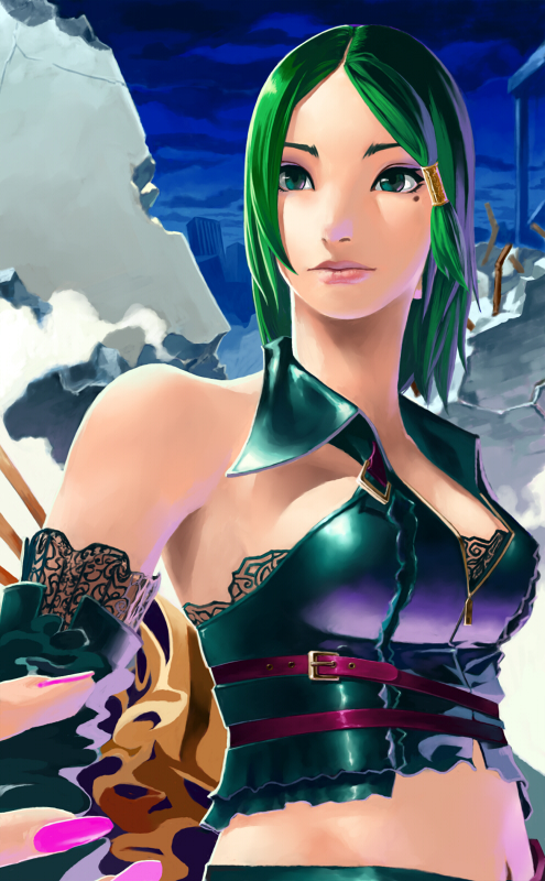 1girldetached sleevesfemale focusfingernailsgreen hairmidriffmolemole under eyenail (hardware)nail polishpink nailssolo