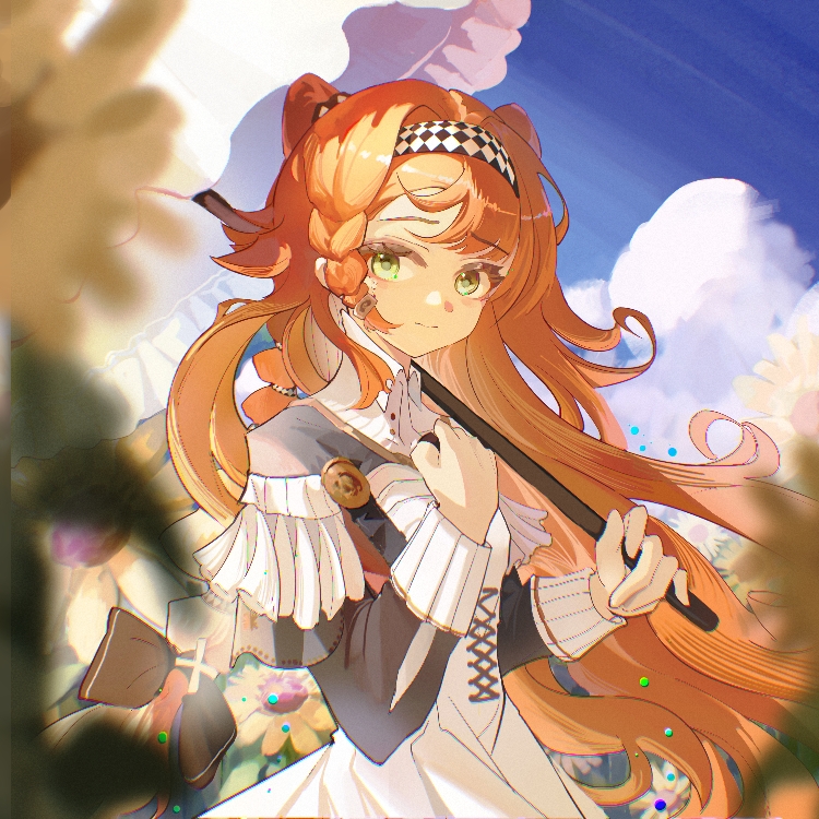 1girlblue skybraidbraided sidelockcheckered hairbandclosed mouthcloudcollared dressdaydressfieldflowerflower fieldgreen eyesgrey cloakgrey sleeveshairbandhands uphigh collarholdingholding umbrellalong hairlooking at viewerorange hairoutdoorsskysmilesolosunflowersunflower fieldtwo side upumbrellaumbrella over shoulderupper bodyvery long hairwhite dressyellow flower