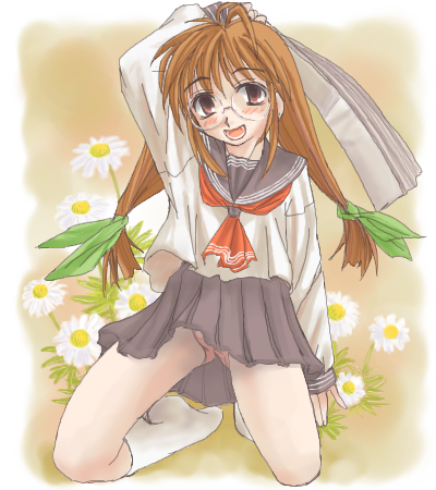 nogizaka haruka, nogizaka haruka no himitsu, highres, third-party edit, 00s, blush, clothes lift, hairband, long hair, panties, school uniform, serafuku, skirt, skirt lift, solo, underwear