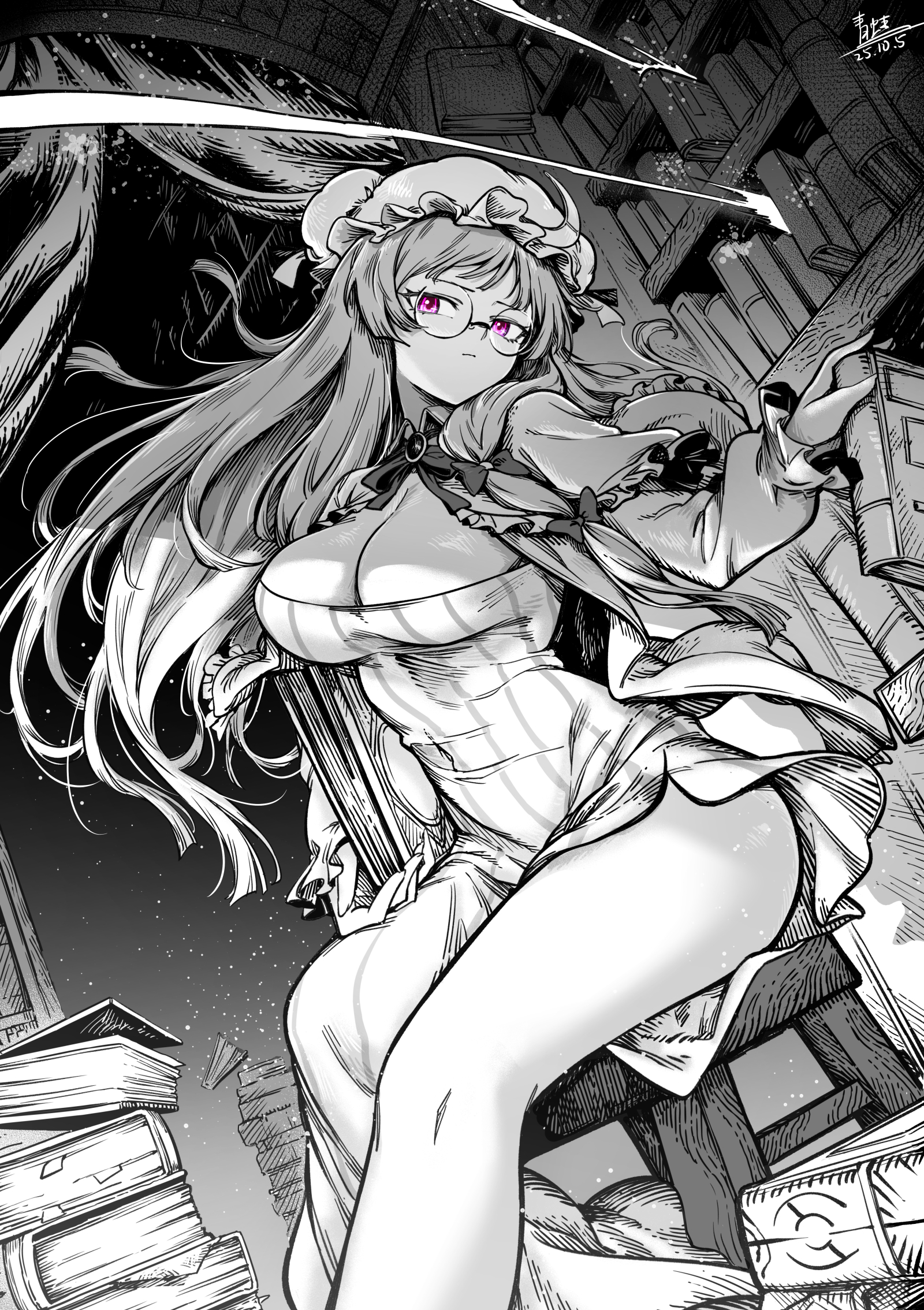renunbo, patchouli knowledge, touhou, bad id, bad pixiv id, 1girl, female focus, hat, long hair, purple eyes, purple hair, ribbon, solo