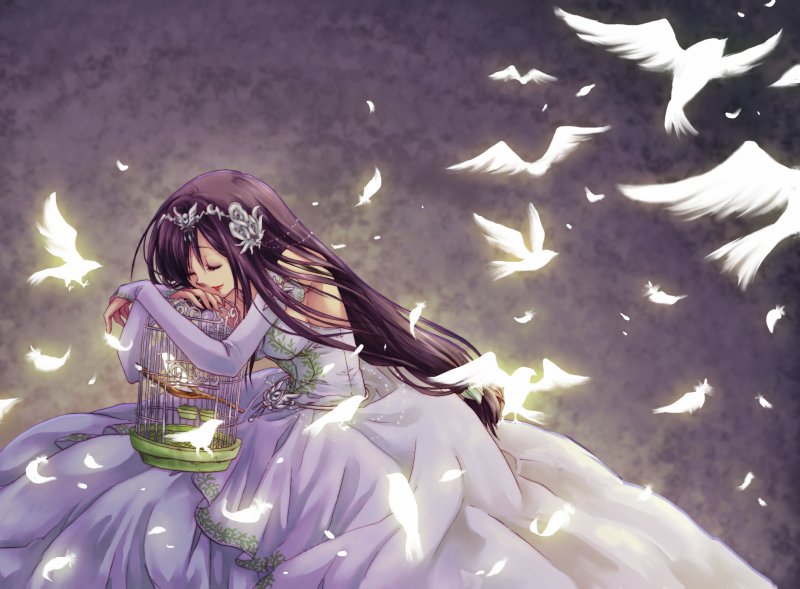 00s1girlbirdblack haircageclosed eyesdetached sleevesdressfemale focusgownhair ornamentlong hairlow-tied long hairofficial alternate costumesolo