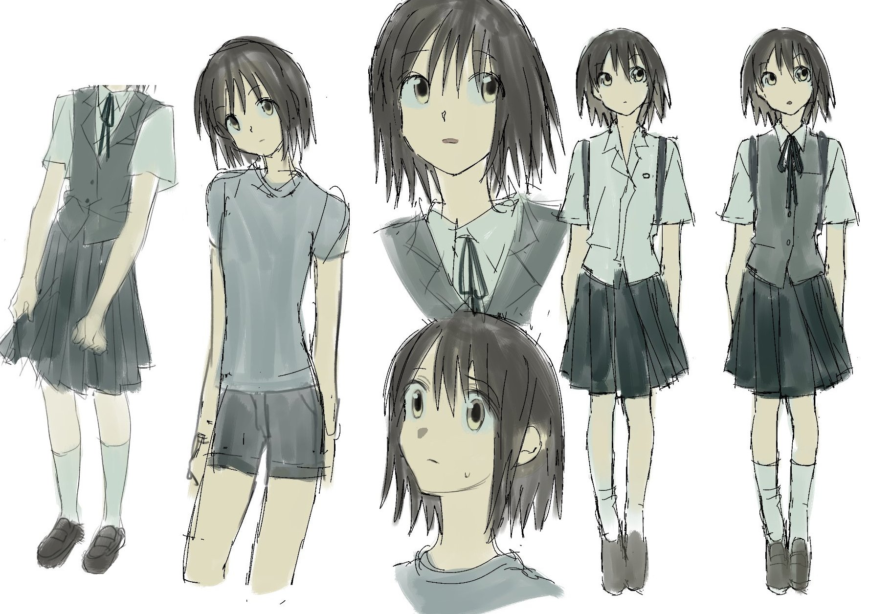 yuutarou, minashiro tsubaki, soukyuu no fafner, uniform, 00s, 1girl, blush, boots, brown hair, female focus, full body, grey eyes, long sleeves, looking back, simple background, solo, undressing, white background