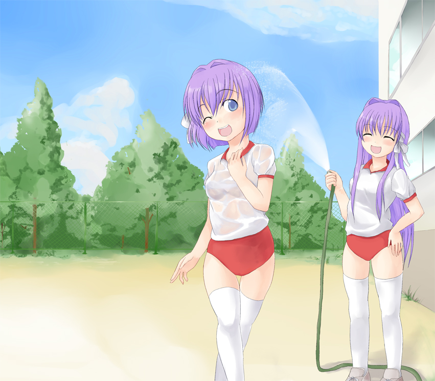00s2girlsblue eyesburumaclosed eyesgym uniformhosemultiple girlsone eye closedpurple hairshort hairsiblingssistersthighhighstwinswetwink