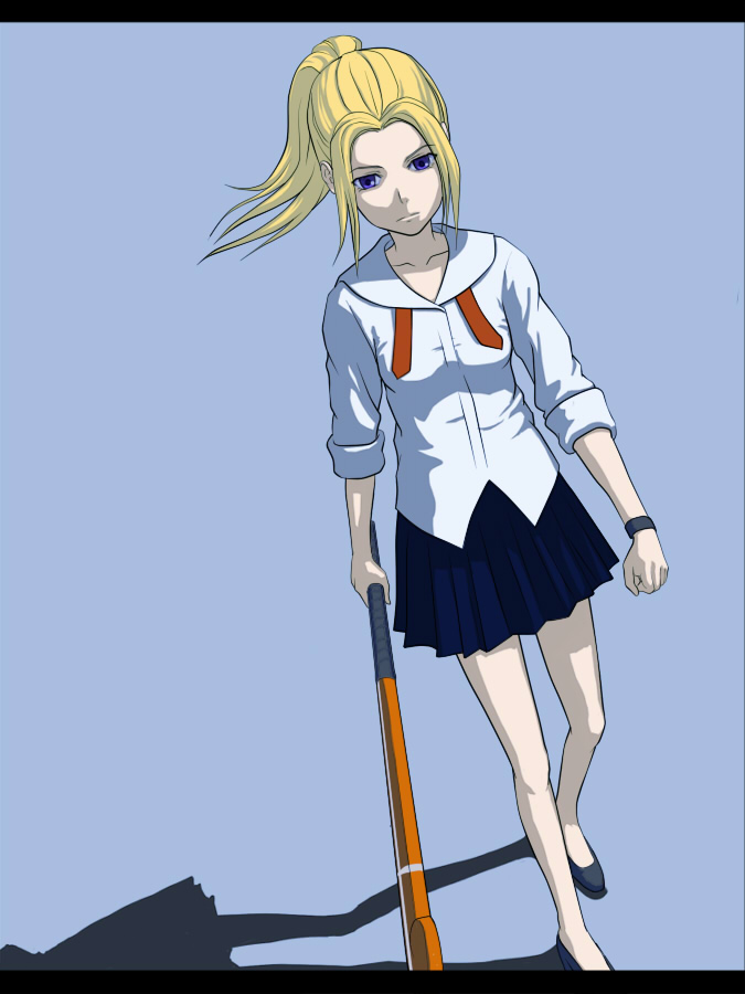 1girlblonde hairblue backgroundblue eyesbraceletfemale focushockey stickjewelryletterboxedlong hairpleated skirtponytailpurple eyesschool uniformshadowskirtsleeves rolled upsolo