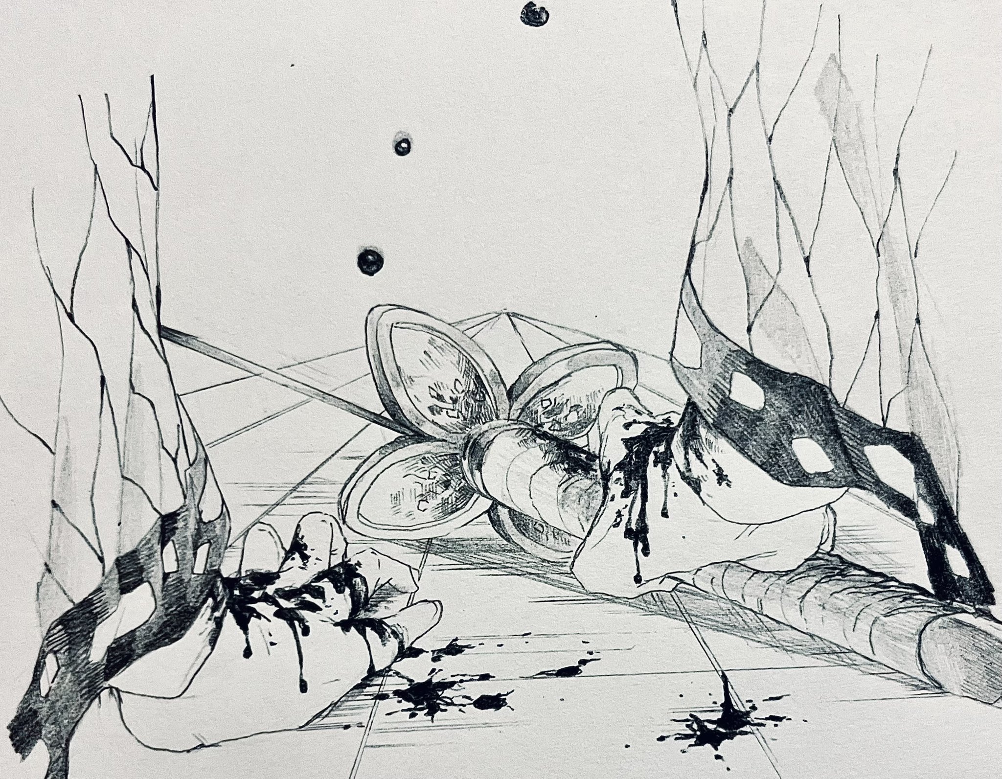 arin (pangya), pangya, translation request, 1girl, artist self-insert, ass, bare shoulders, black panties, black pantyhose, blue eyes, blue hair, blush, breasts, cameltoe, crotch seam, female focus, flower, hair flower, hair ornament, legs, long hair, long sleeves, looking at viewer, lying, medium breasts, off-shoulder sweater, off shoulder, on side, panties, panties under pantyhose, pantyhose, ribbed sweater, shoes, simple background, smile, solo, sweater, thighband pantyhose, thighs, trefoil, underwear, white background, yellow sweater