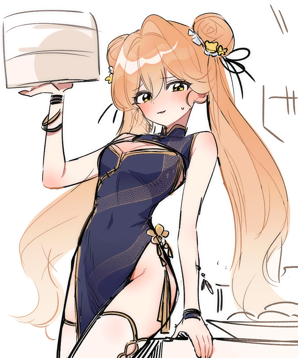 1girlalternate costumealternate hairstylebamboo steamerbare armsbare shouldersblack dressbreastschina dresschinese clothescleavage cutoutclosed mouthclothing cutoutcovered naveldouble bundresshair bunhand upholding bamboo steamerlong hairlooking at viewermedium breastsno pantiesorange hairpelvic curtainsleevelesssleeveless dresssmilesolothigh strapthighstonguetongue outtwintailsvery long hairyellow eyes