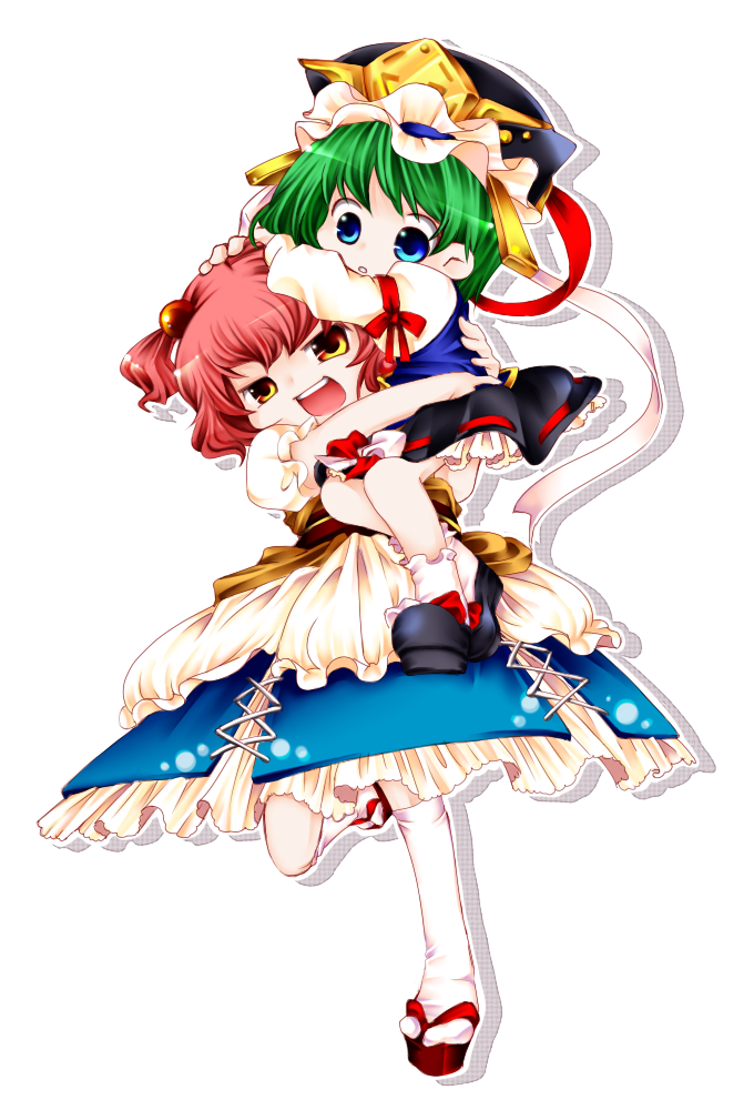 2girlsblue eyescarryingchildfemale focusfull bodygreen hairhatmultiple girlsopen mouthorange eyesred hairribbonrunningshort hairsimple backgroundstandingwhite background