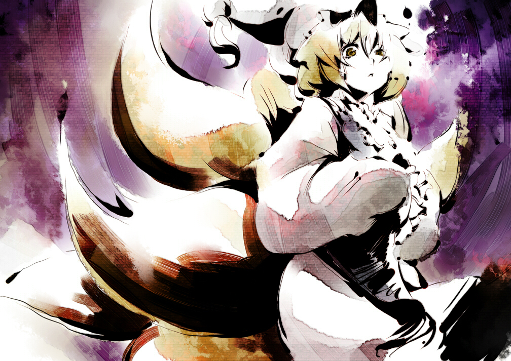 1girlanimal hatblonde hairfemale focusfox tailhatlong sleevesmob capshort hairsolotailtasselwide sleevesyellow eyes