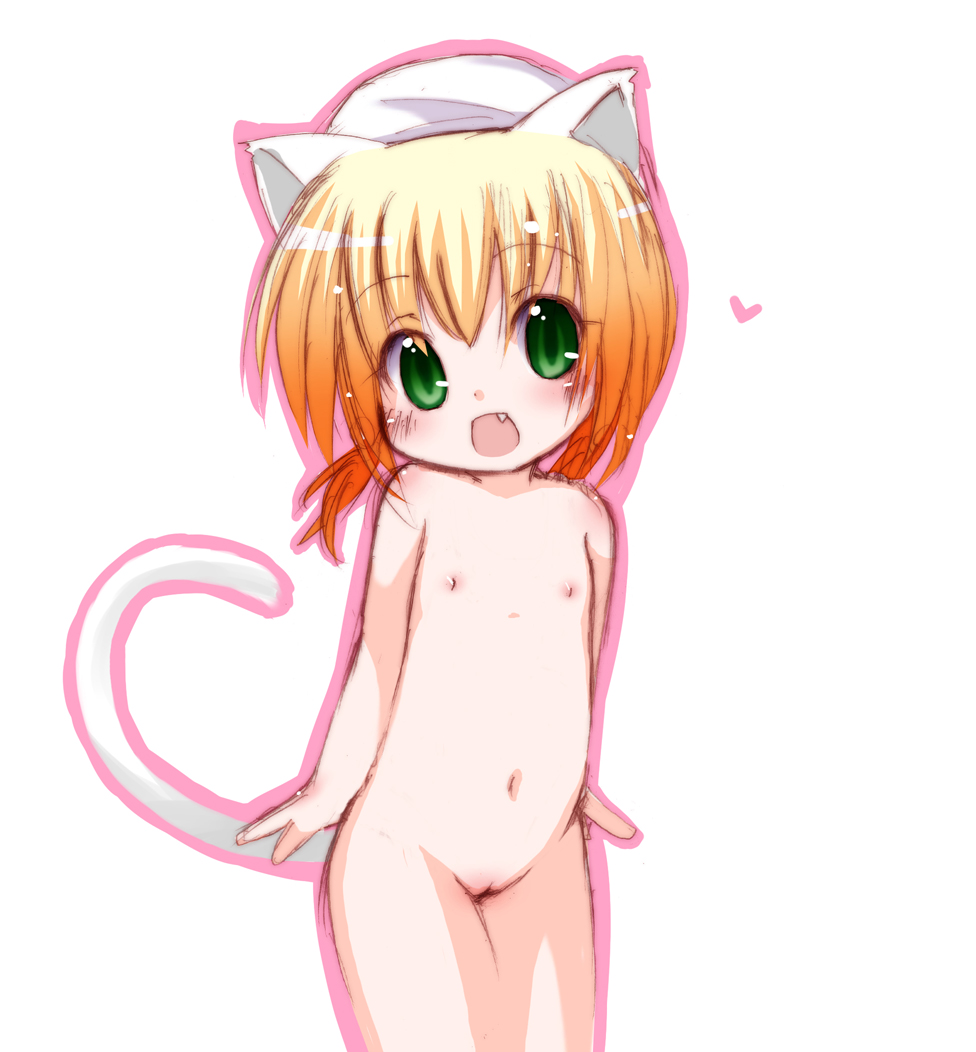 1girlanimal earsblonde haircowboy shotfangfemale focusflat chestgreen eyesheartlolinipplesnudeopen mouthpussyshort hairsolotailwhite background