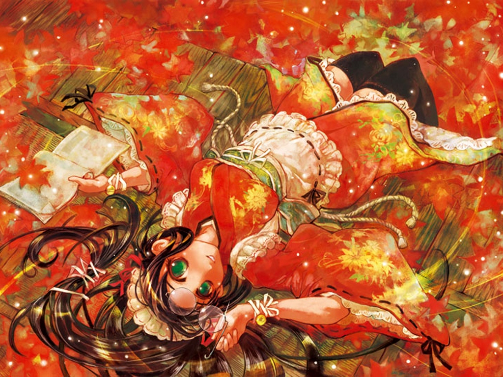 1girlautumnblack hairbookfrillsglassesgreen eyesjapanese clotheskimonoleaflong hairlyingribbonthighhighs