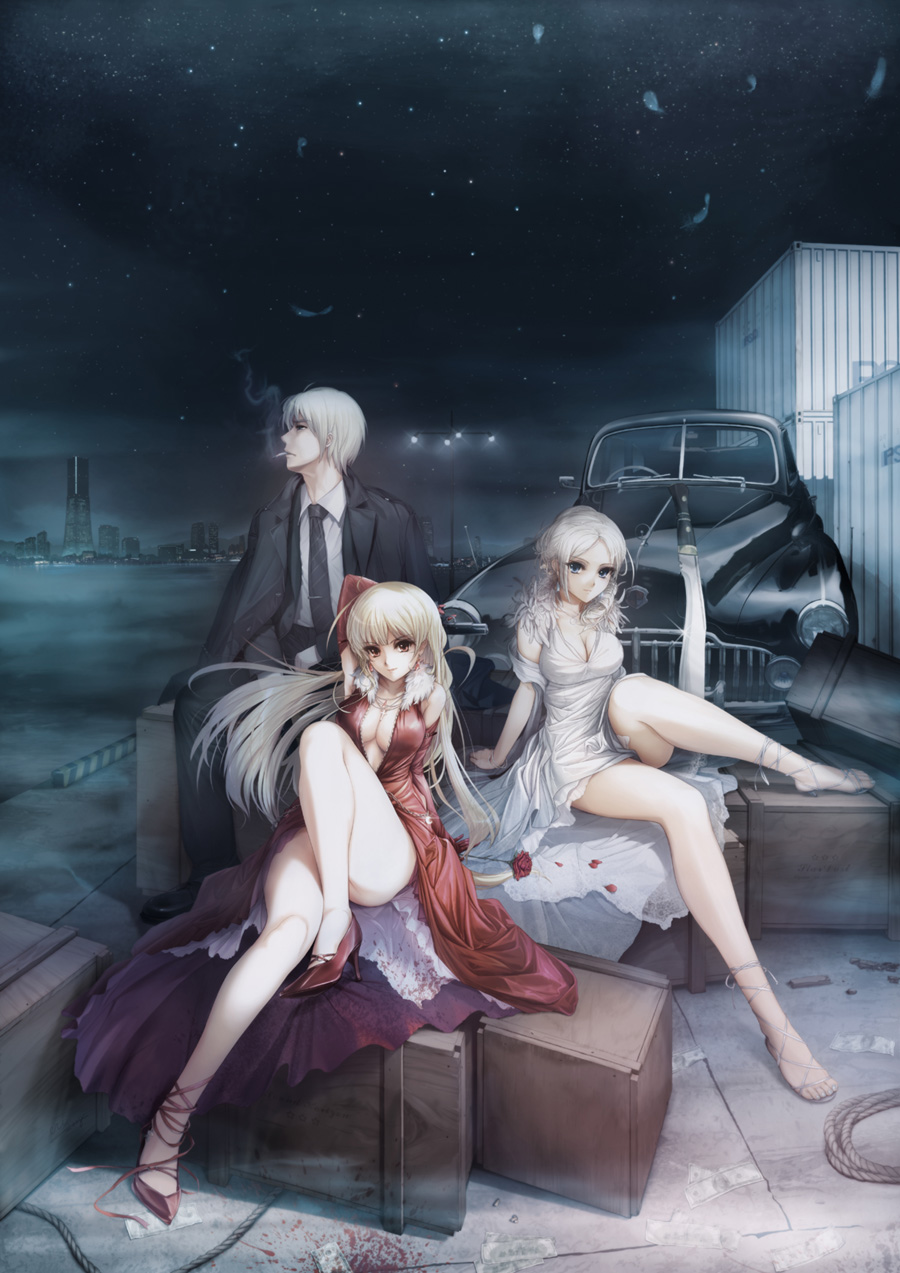 1boy2girlsankle lace-uparm behind headblonde hairbreastscarcigarettecleavagedresselbow glovesglovesgreen eyesgunhandgunhigh heelslace-up heelsleg uplegslong legsmotor vehiclemultiple girlsopen shoessemi-automatic pistolshoessittingsmilesmokingswordthighstrigger disciplineweaponyellow eyes