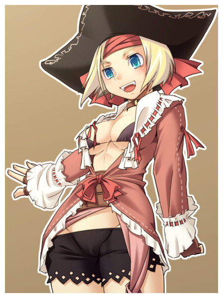 kazuma muramasa, ragnarok online, lace-trimmed legwear, 1girl, arm under breasts, blue background, breasts, brown necktie, brown thighhighs, cleavage, copyright name, cropped jacket, female focus, garter belt, garter straps, glasses, hairband, head tilt, kafra uniform, lace, lace trim, large breasts, looking at viewer, maid, maid headdress, nail polish, necktie, outline, pen, pink nails, red hair, red nails, smile, solo, standing, thighhighs, waitress, yellow eyes