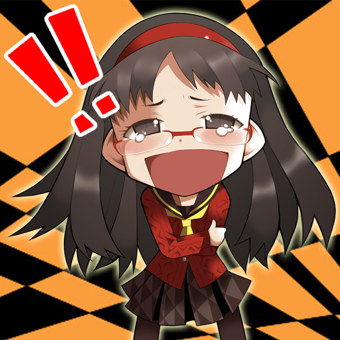:d1boyblack eyesblack hairchibiglasseshairbandlaughingopen mouthpantyhoseschool uniformsmilesolotears