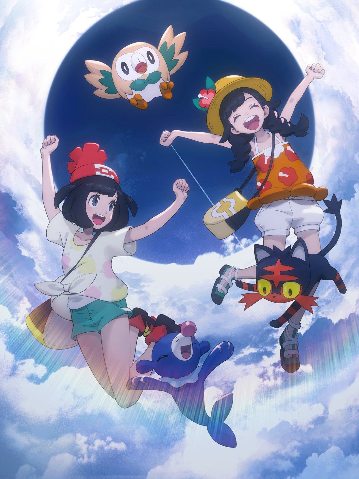 2girlsarms upbagbeaniebirdblack haircatclosed eyesclosed mouthcolored sclerafloral printflowergen 7 pokemongreen shortshathat flowermultiple girlsopen mouthorange tank topowlpokemon (creature)red hatsea lionshirtshort hairshort sleevesshortsshoulder bagsmilestarter pokemon triotank topteethtied shirttopple33twintailsupper teeth onlywhite shortswingsyellow sclerayellow shirt