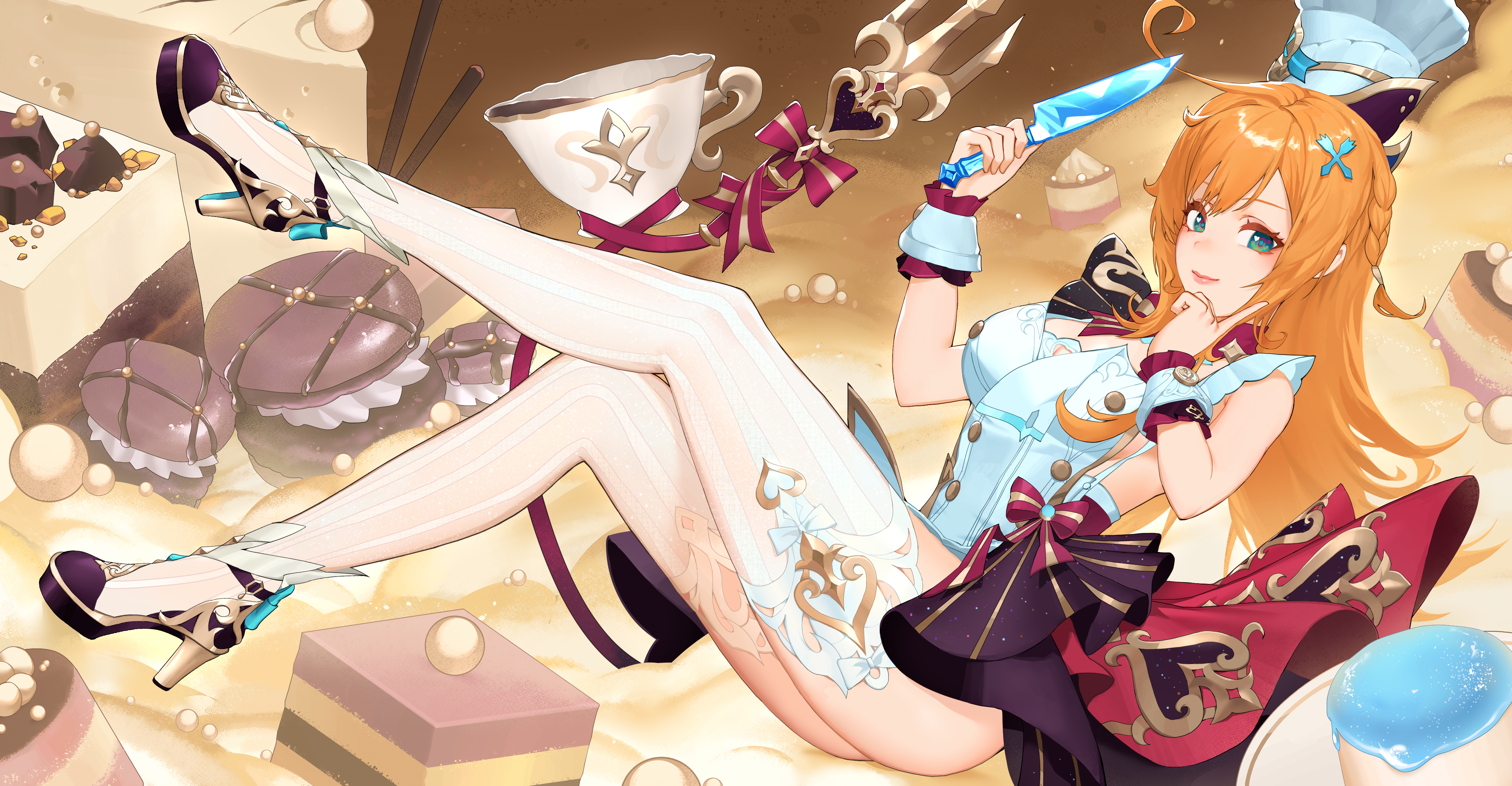1girlahogeblue eyesbreastscakechef hatchocolate cakecupdressfoodhathigh heelsholdingholding knifekitchen knifeknifelarge breastslegsorange hairsoloteacupthighhighsthighswhite dresswhite thighhighs