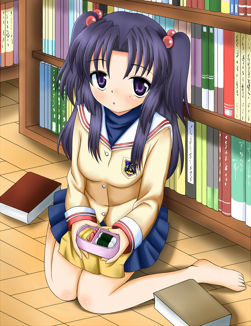 00sbarefootbentoblue hairbookfoodfood artlibrarylong hairpurple eyesschool uniformsolotako-san wienertwintailstwo side up