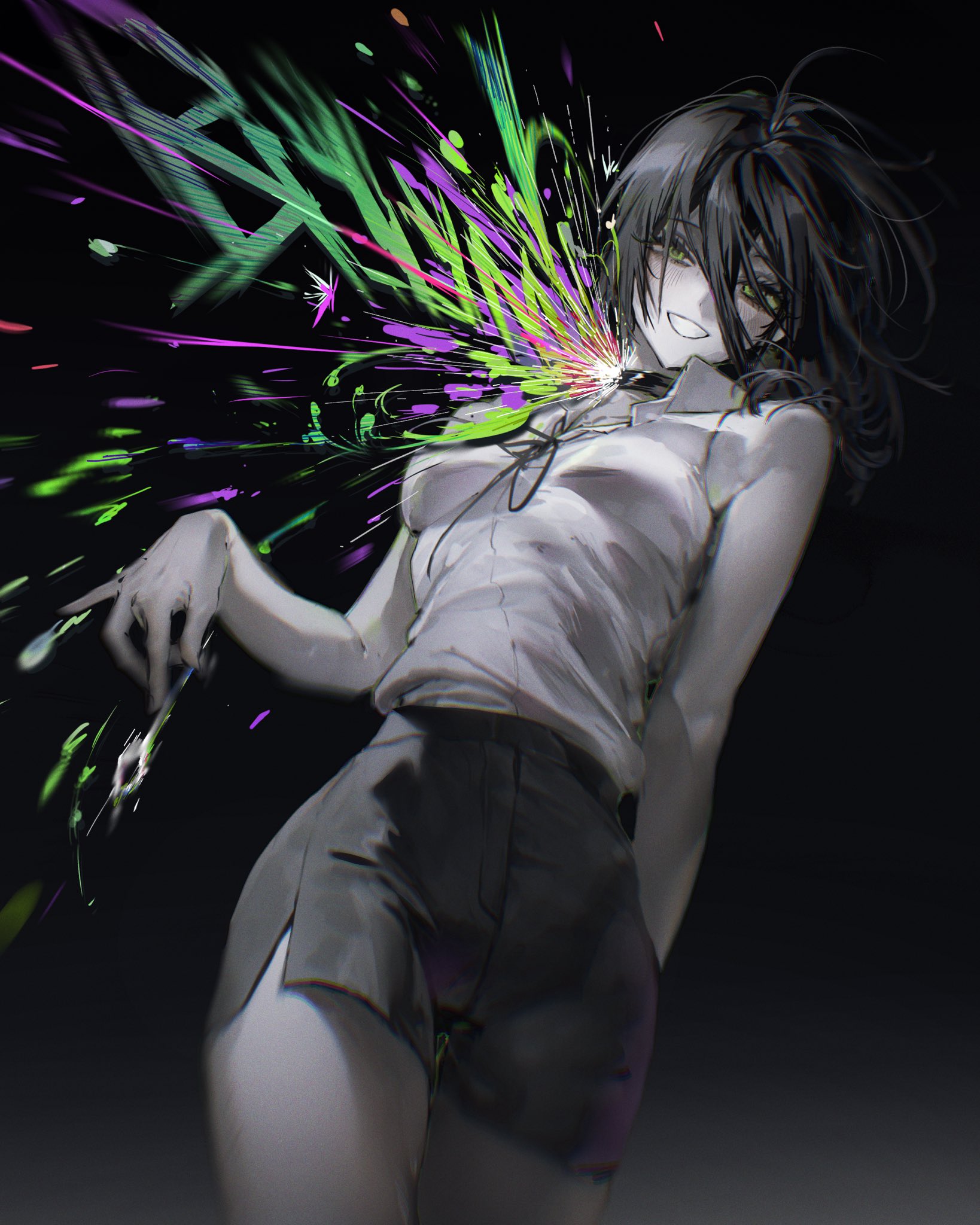 chuvuyaa, kneesocks (psg), panty & stocking with garterbelt, highres, 1girl, blue hair, breasts, colored skin, demon girl, demon horns, green eyes, horns, long hair, looking at viewer, medium breasts, ponytail, red skin, solo