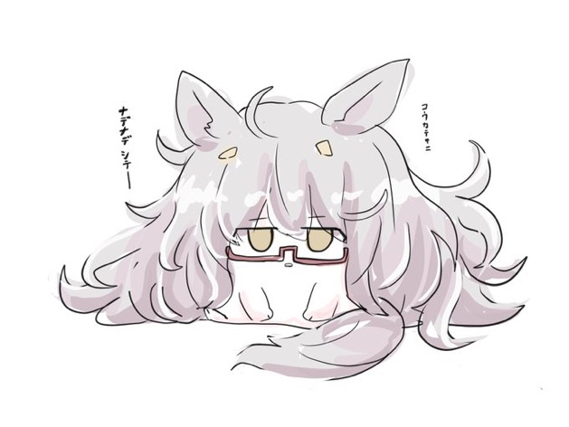animal earsbrown eyesglassesgrey hairhorse earslong hairlooking at viewerparted lipsred-framed eyewearsemi-rimless eyewearsimple backgroundsolounder-rim eyewearwhite background