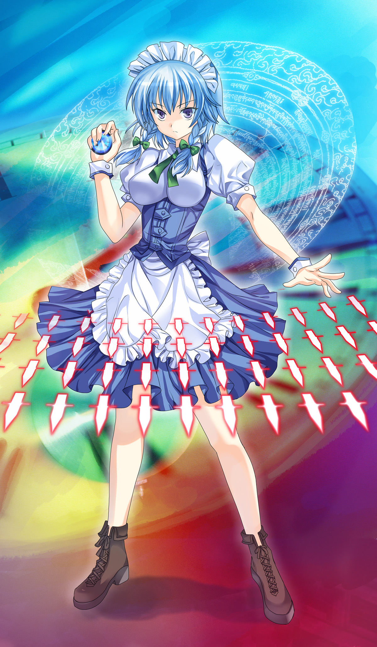 1girlblue eyesbreastsclockfemale focushairbandknifemaidmedium breastsribbonshort hairsolothrowing knifeweapon