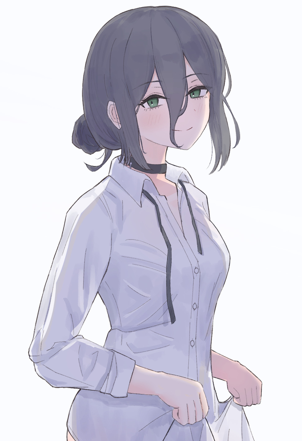 1girlblack chokerblack hairblack ribbonchokerclosed mouthcollared shirtgreen eyesgrey shirthair between eyeshair bunneck ribbonracck0508ribbonshirtsimple backgroundsmilesoloundone neck ribbonwhite background