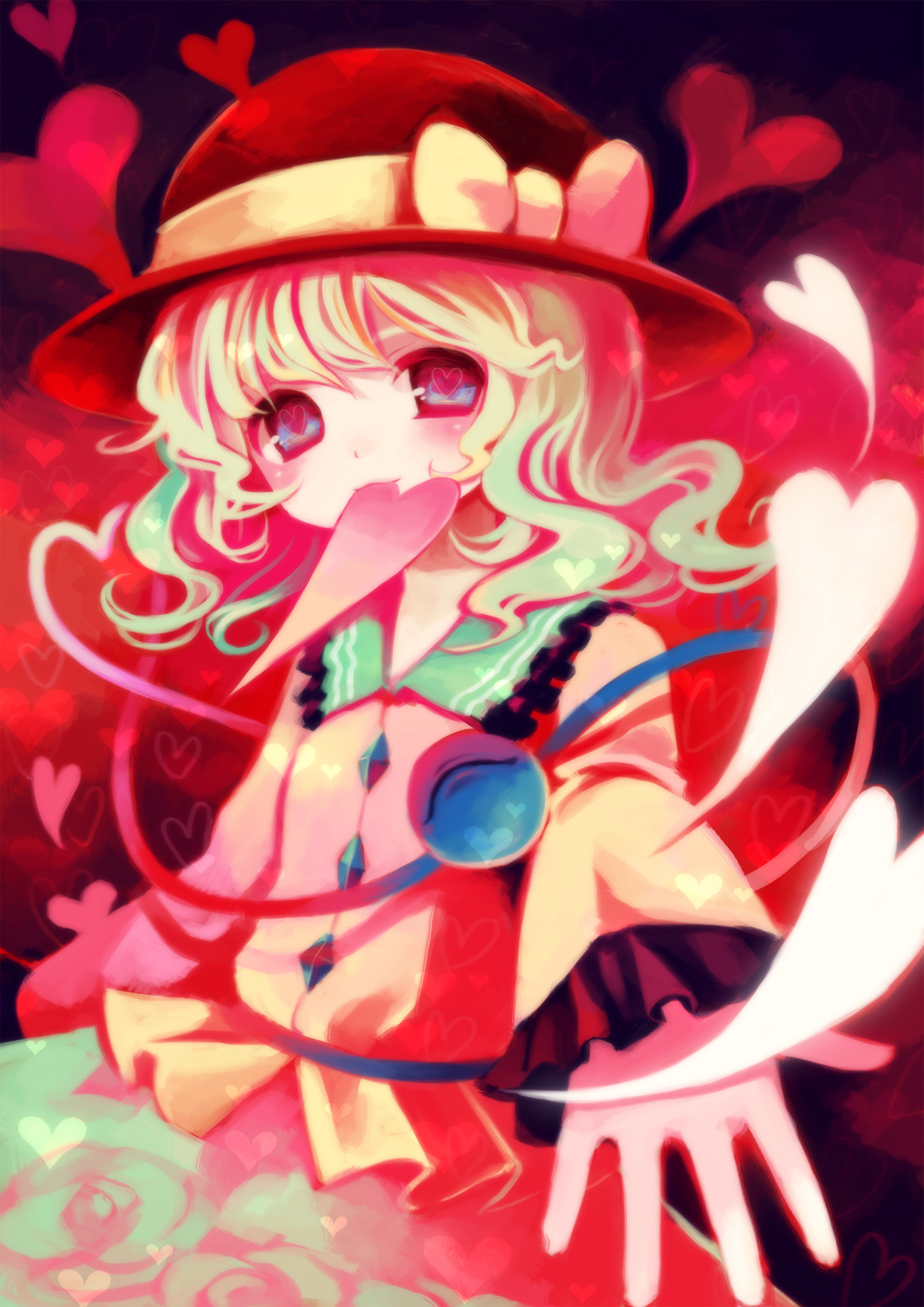 1girlbeckoningblue eyesfemale focusflowergradient backgroundhatheartmouth holdplantribbonshort hairskirtsolowhite hair