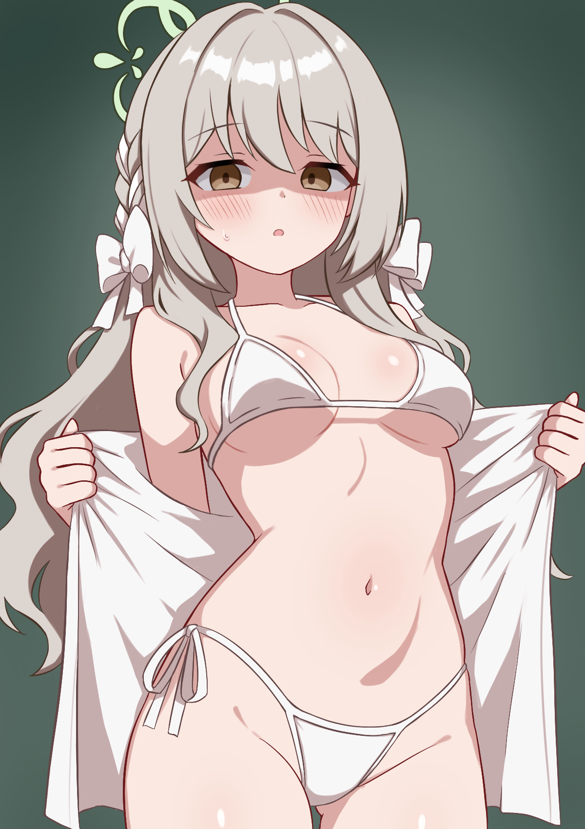 1girlbikinibowbreastsbrown eyesbrown haircowboy shotgreen backgroundgreen halohair bowhalolong hairlooking at viewermedium breastsnavelopen mouthshaded faceshirtside-tie bikini bottomsolostomachswimsuitwhite bikiniwhite bowwhite shirt