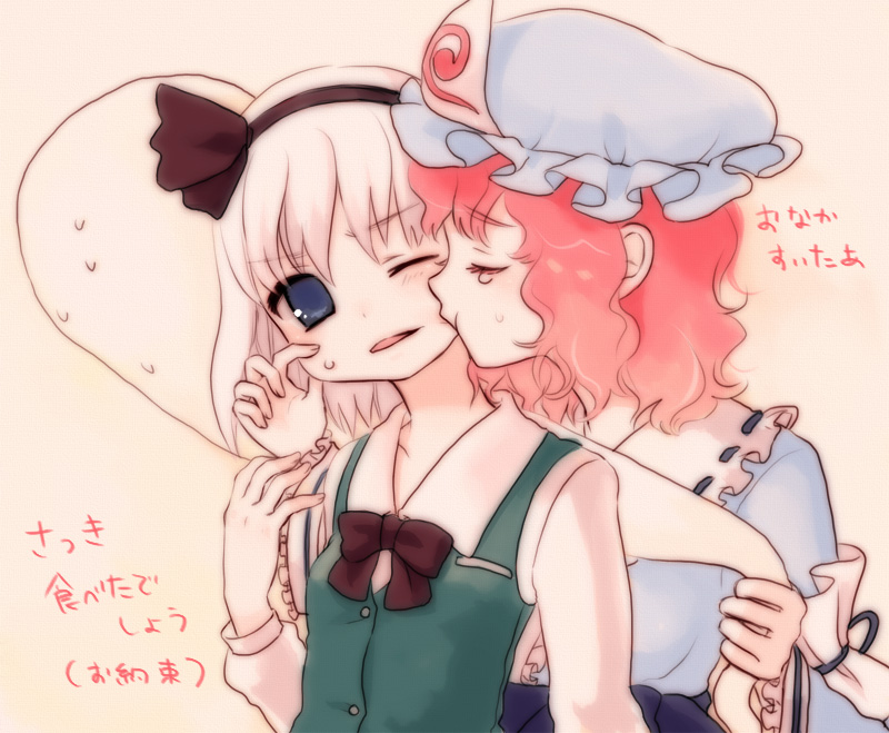 2girlsbitingblue eyescheek pinchingfemale focushairbandhatmultiple girlspinchingpink hairribbonshort hairtears